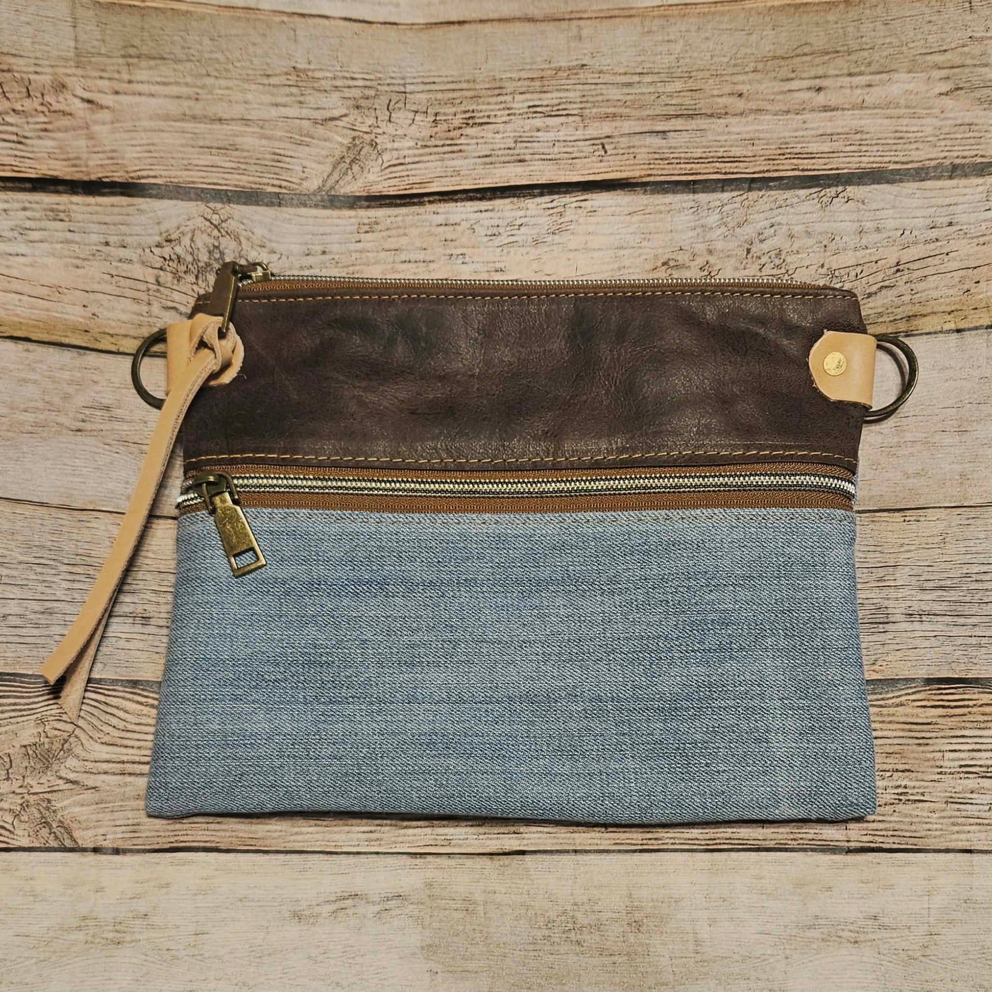 Addie Belle Re-purposed Light Wash Denim/ Brown Leather & Veg Tan Leather Crossbody Bag