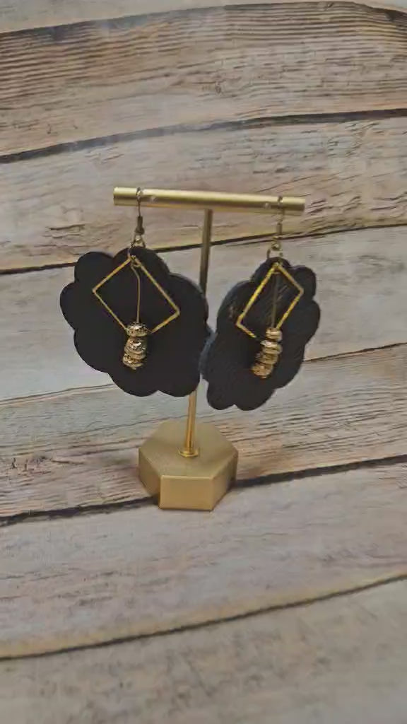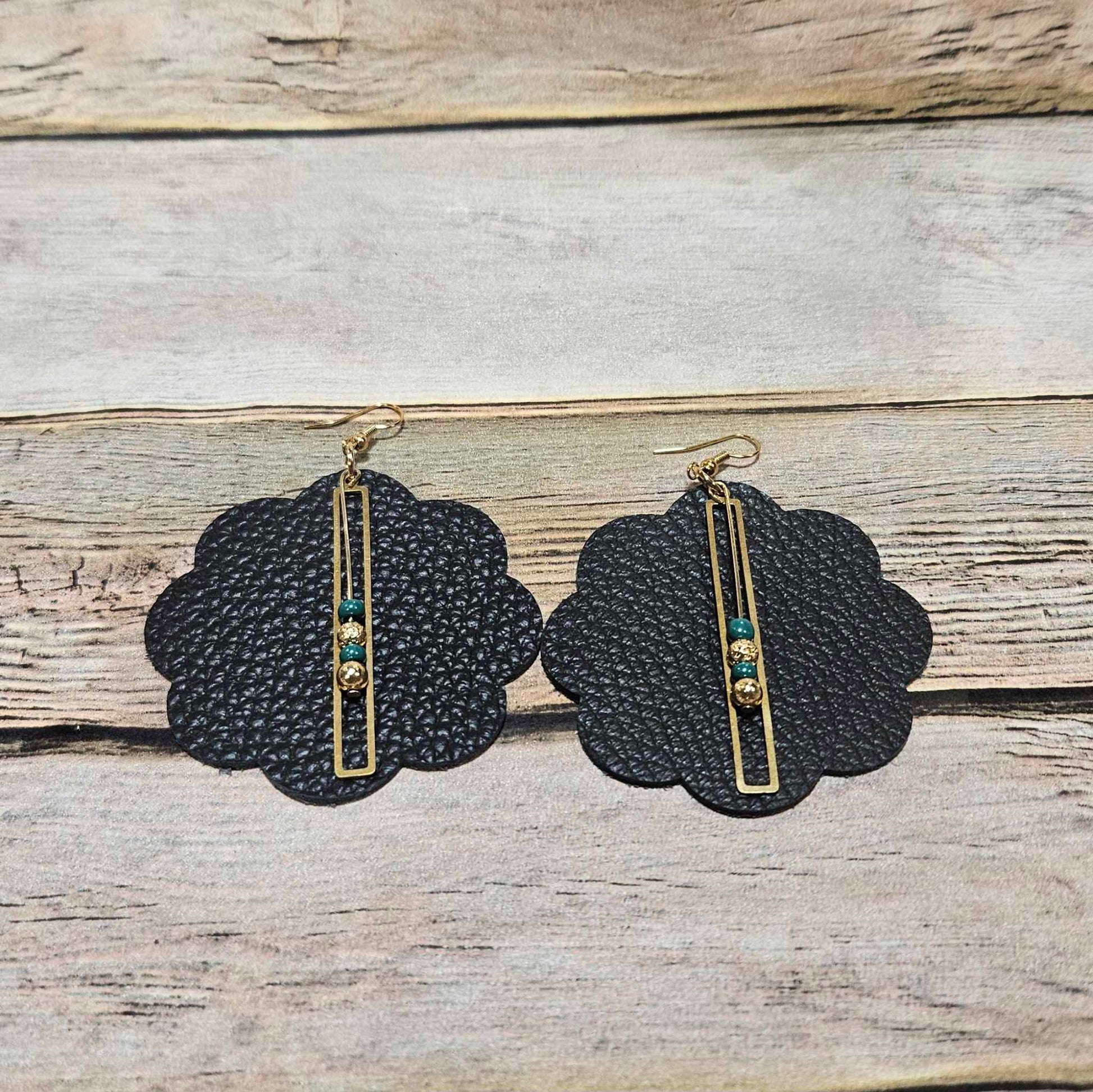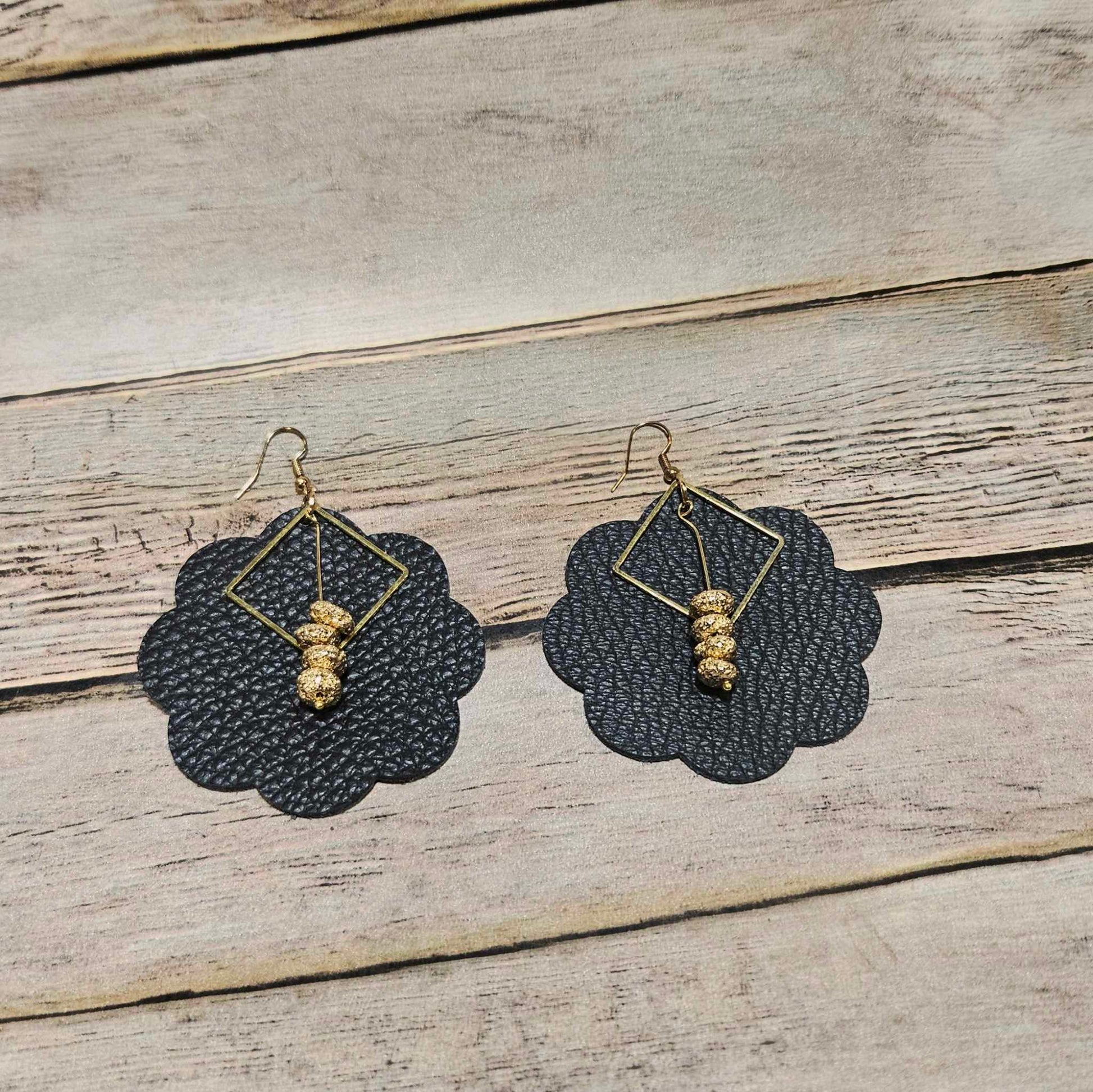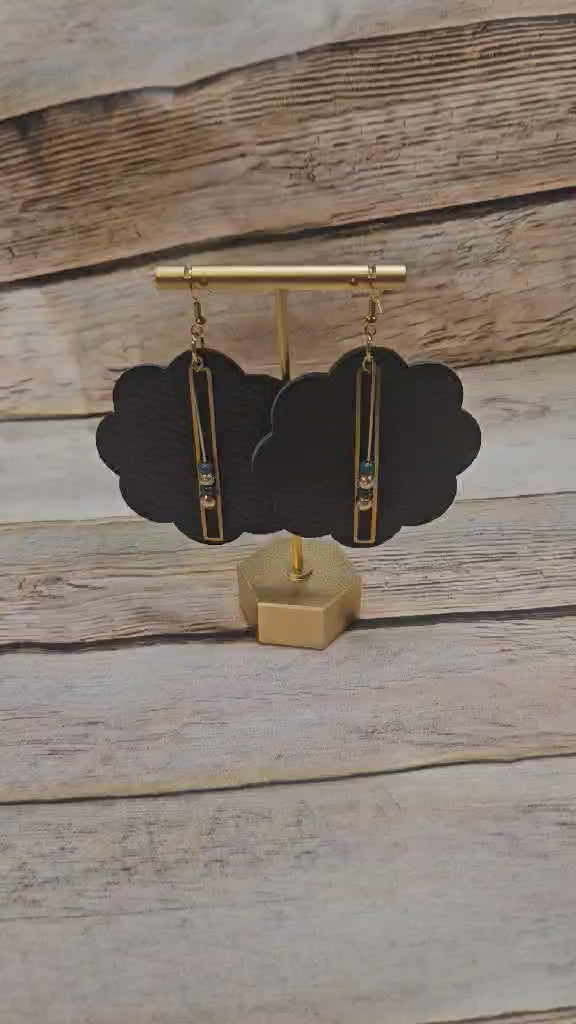 These handcrafted earrings are made with genuine dyed leather pieces and glass beads. Each piece is adorned with antique gold, rose gold, silver or gold hardware.