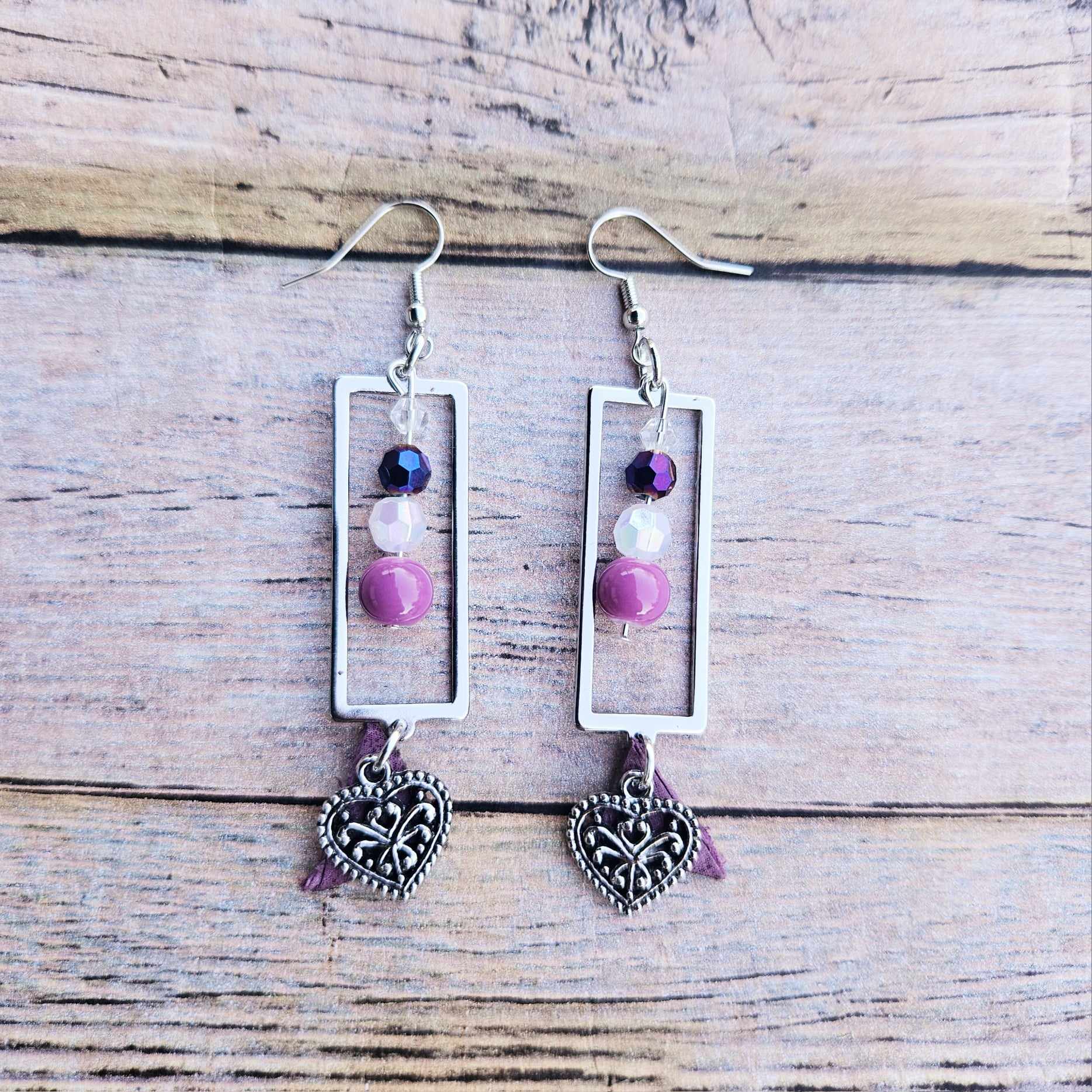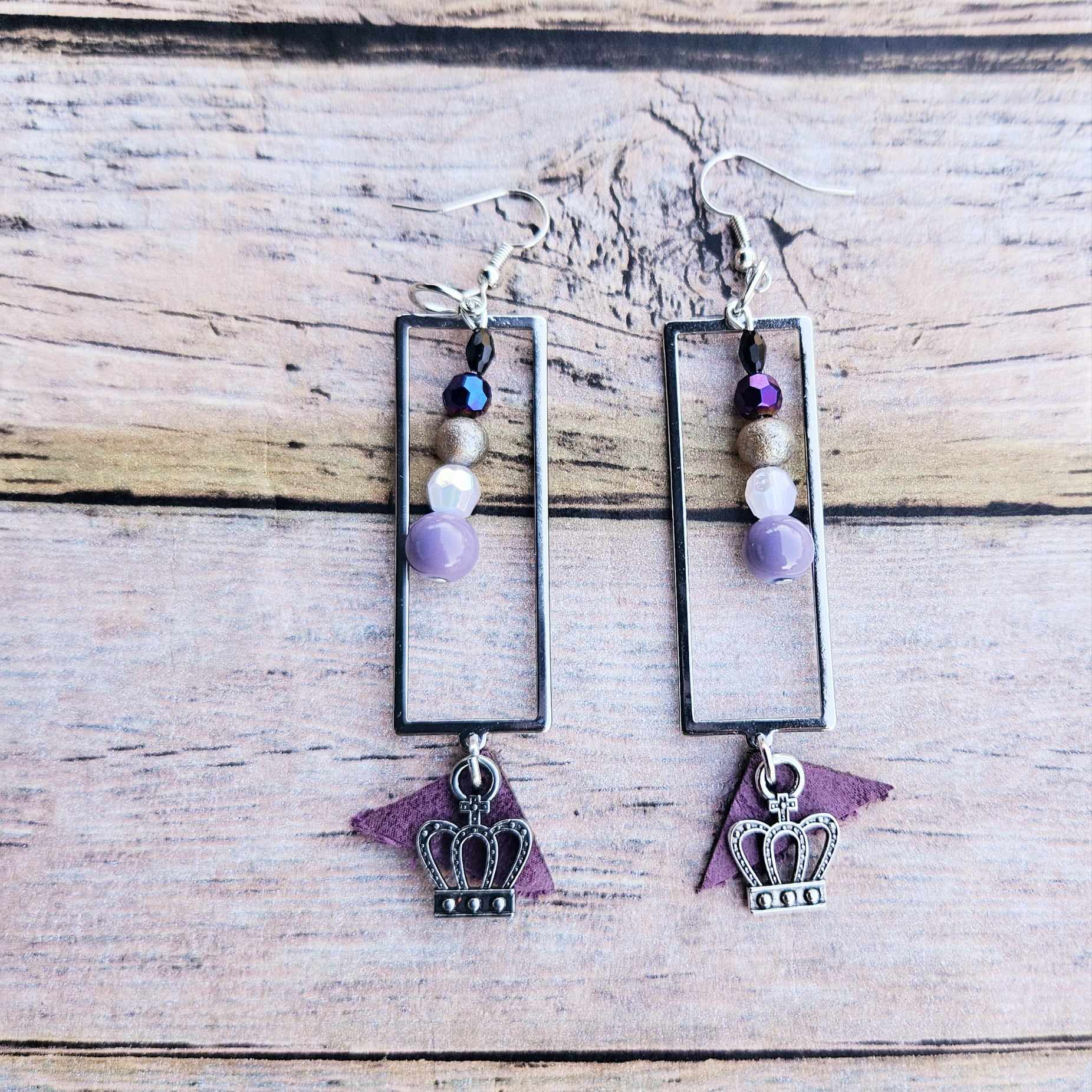 These handcrafted earrings are made with genuine leather pieces and glass beads. Each piece is adorned with antique gold, rose gold, silver or gold hardware.
