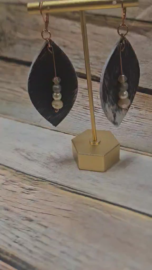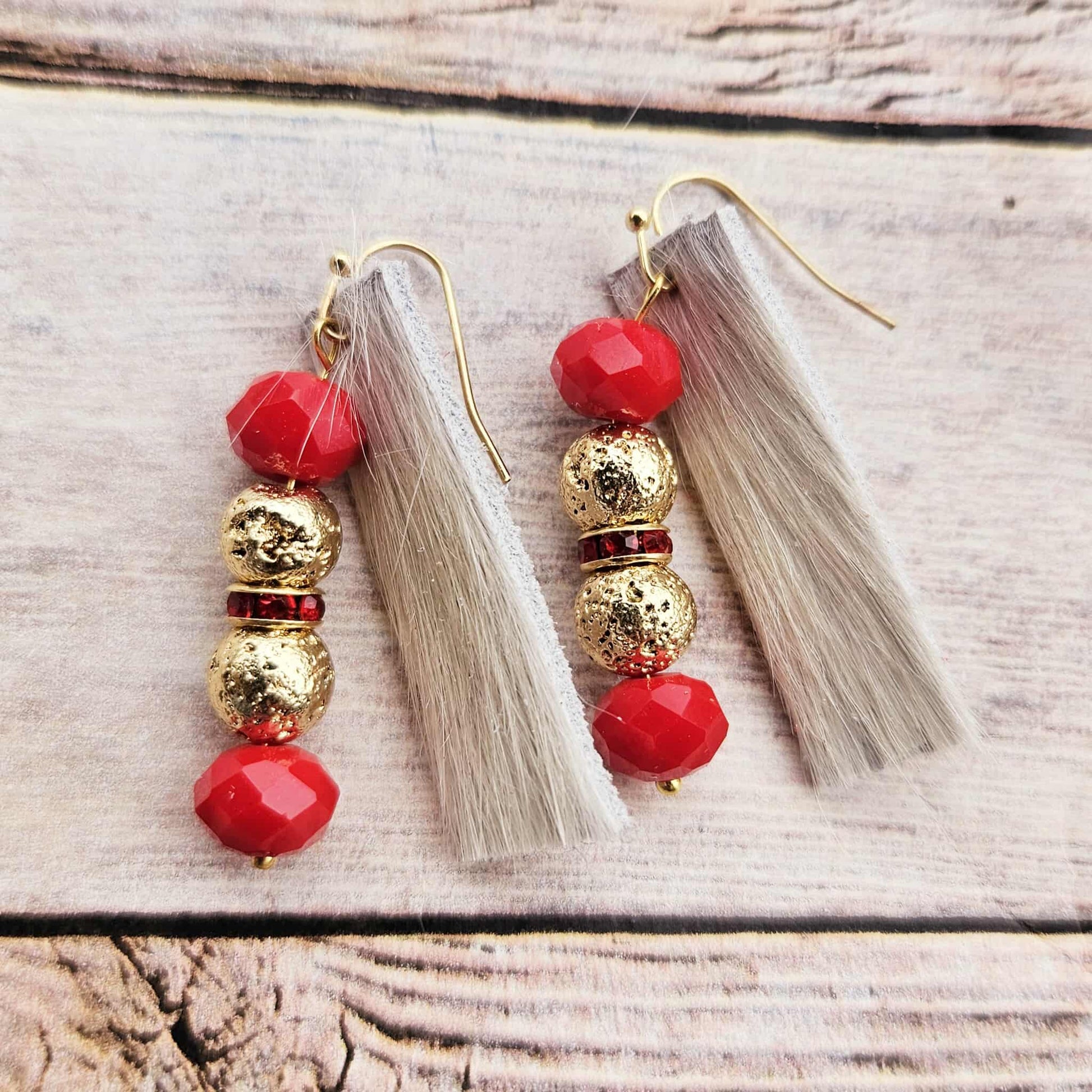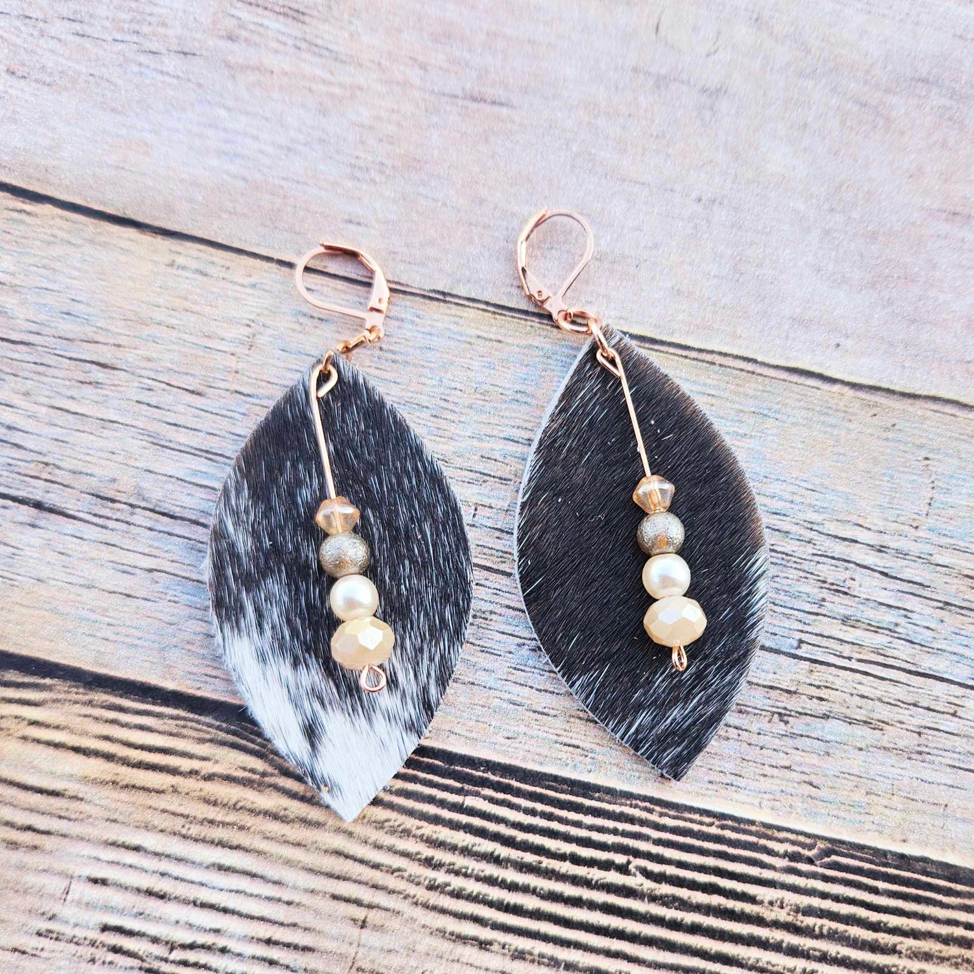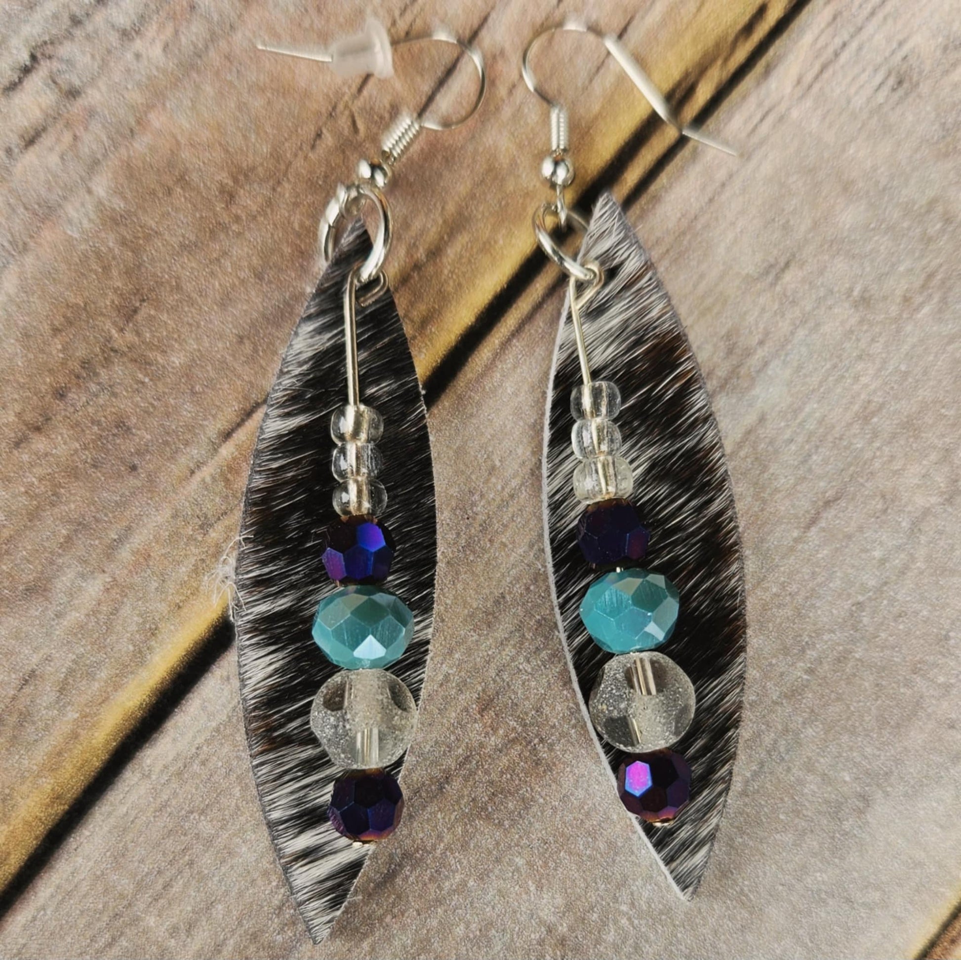 These unique, handcrafted earrings showcase vibrant fur on print leather in various shapes and colors. Each pair is meticulously crafted, offering a bold, stylish statement for any occasion.