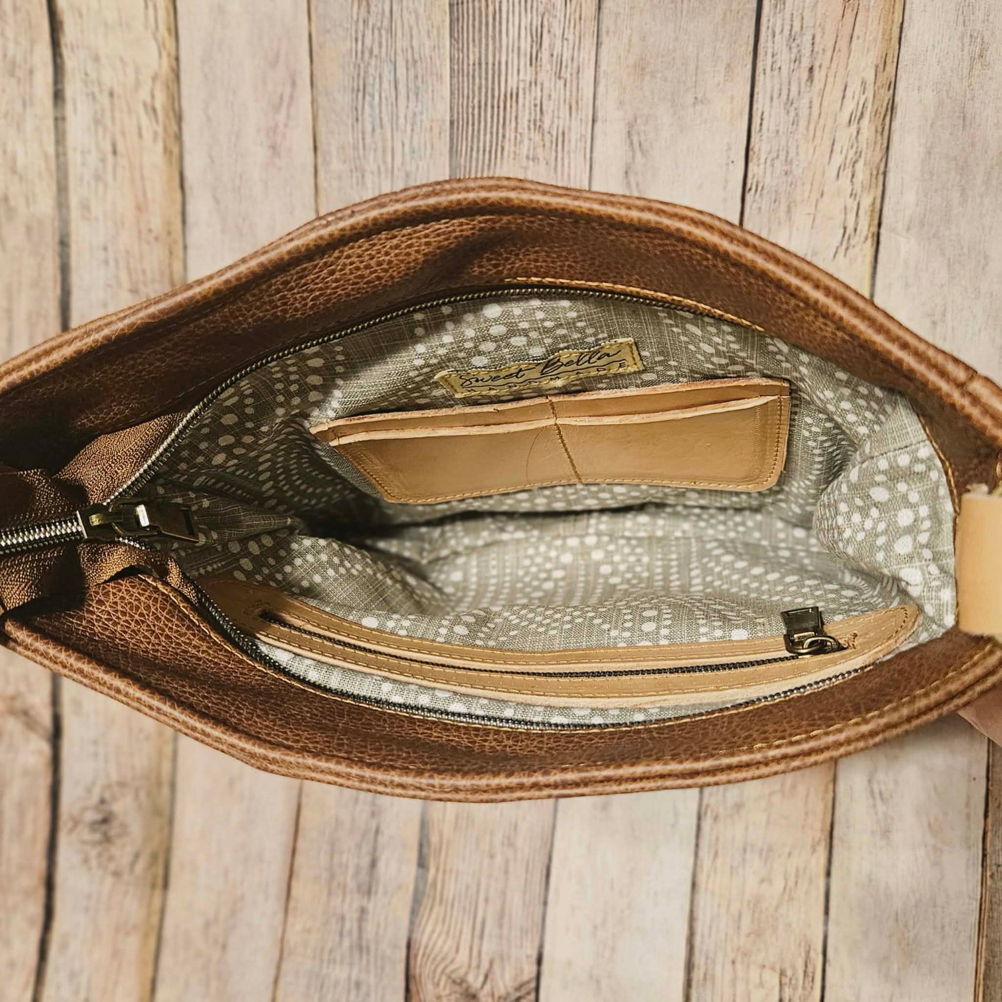 Handcrafted in Texas, this Camel & White Paisley leather crossbody bag channels the bold elegance of Lyndel Grace “Linnie” Millington’s artistic legacy. Its sleek, vintage-style exterior is adorned with a front zipper pocket and a discreet back device pocket, while the interior includes card slots and a secure zipper pocket for everyday essentials. Available in conceal carry or non-conceal carry options, the conceal carry compartment features a Velcro holster for swift, ambidextrous access. Personalize it with your choice of a colorful guitar-style strap or a refined leather strap, crafted with Sweet Bella Bags’ signature Texas quality. A leather strap is available at an additional cost on request.
