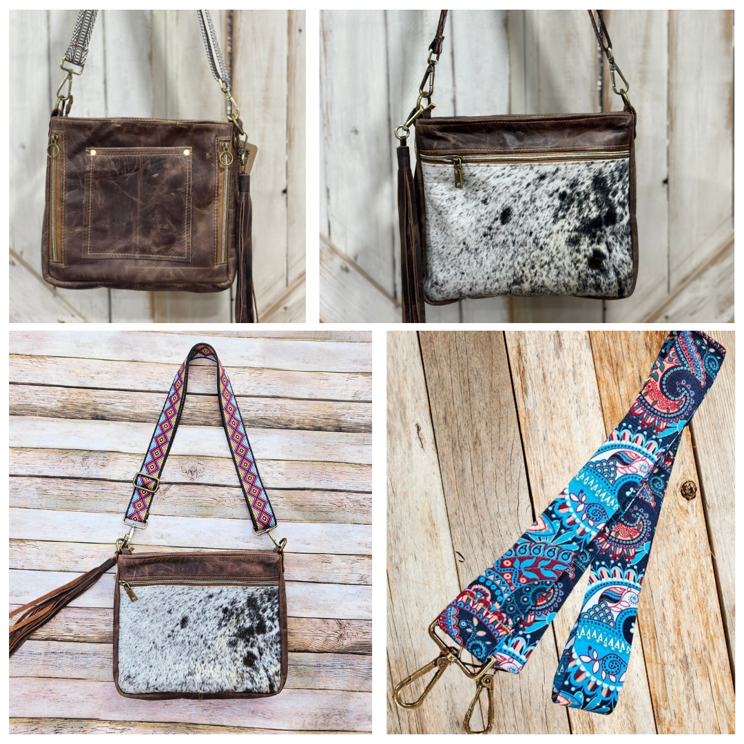 Inspired by the rustic elegance of Tolar, Texas, and Lyndel Grace “Linnie” Millington’s artistic heart, this Texas-handcrafted crossbody bag is crafted from traditional salt and pepper cowhide, with its distinctive mottled pattern. The hide’s natural texture shines, paired with a front zipper pocket and a back device slot, while the interior includes card slots and a zipper pocket. Available with or without a conceal carry option, the conceal carry version features a Velcro holster for quick, safe access. Choose a vibrant guitar-style strap or classic leather strap, making this Sweet Bella Bags creation a true Texas treasure.