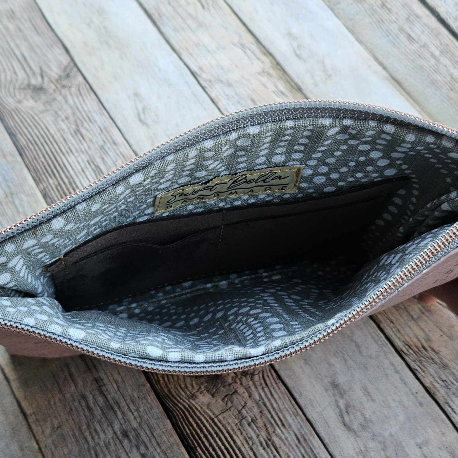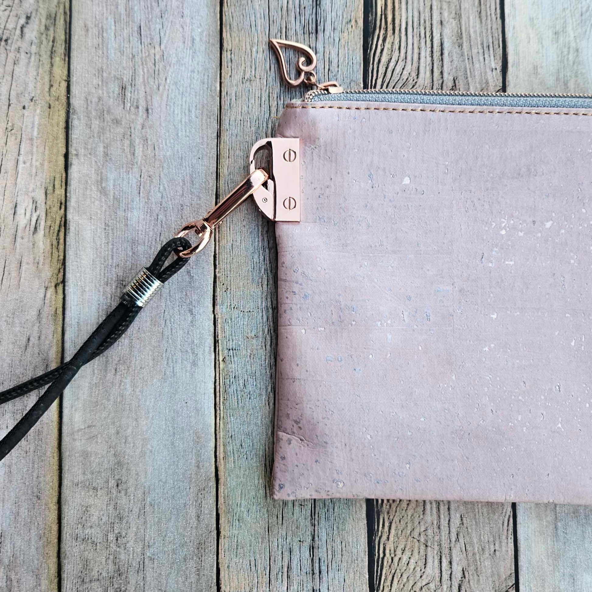 The Oleta Belle cork clutch wristlet is a stylish way to stay organized while on the go. It can be used as a small clutch or with a simple hardware alteration, a crossbody bag. Each wristlet is crafted with quality cork, lined with beautiful fabric, and features several interior card slots. Cork has many material benefits, being supple, durable, and highly resistant to water and most importantly environmentally friendly. The Oleta Bell will perfectly pair with almost any outfit allowing you the ease of safely carrying your phone, keys, cash, cards, makeup and more. Read more on the hardware and materials we use here.