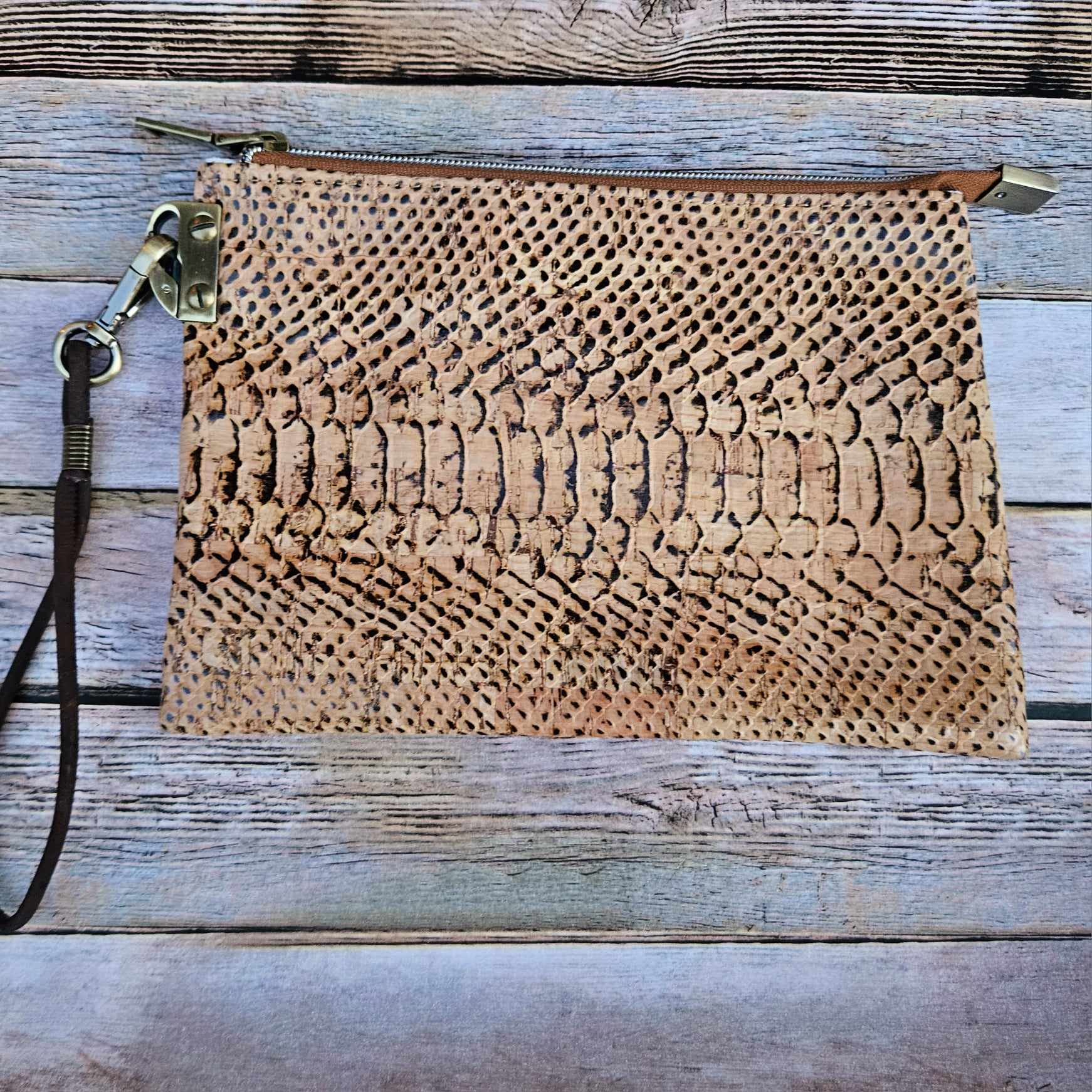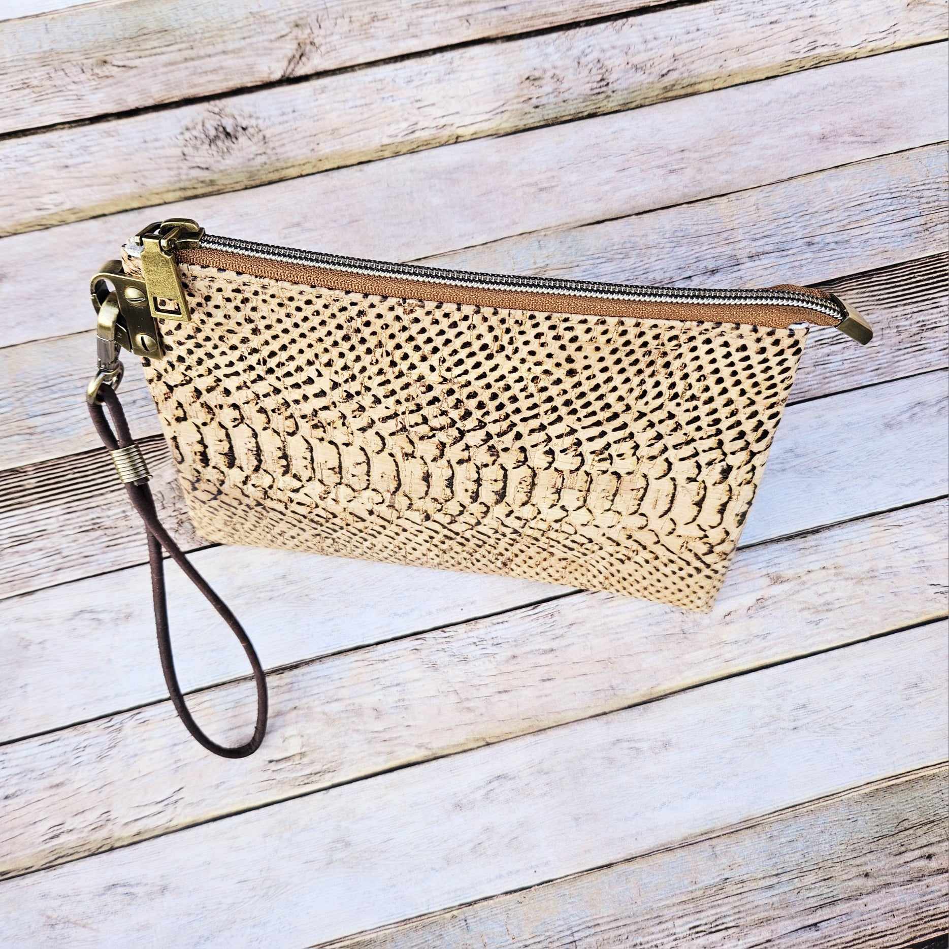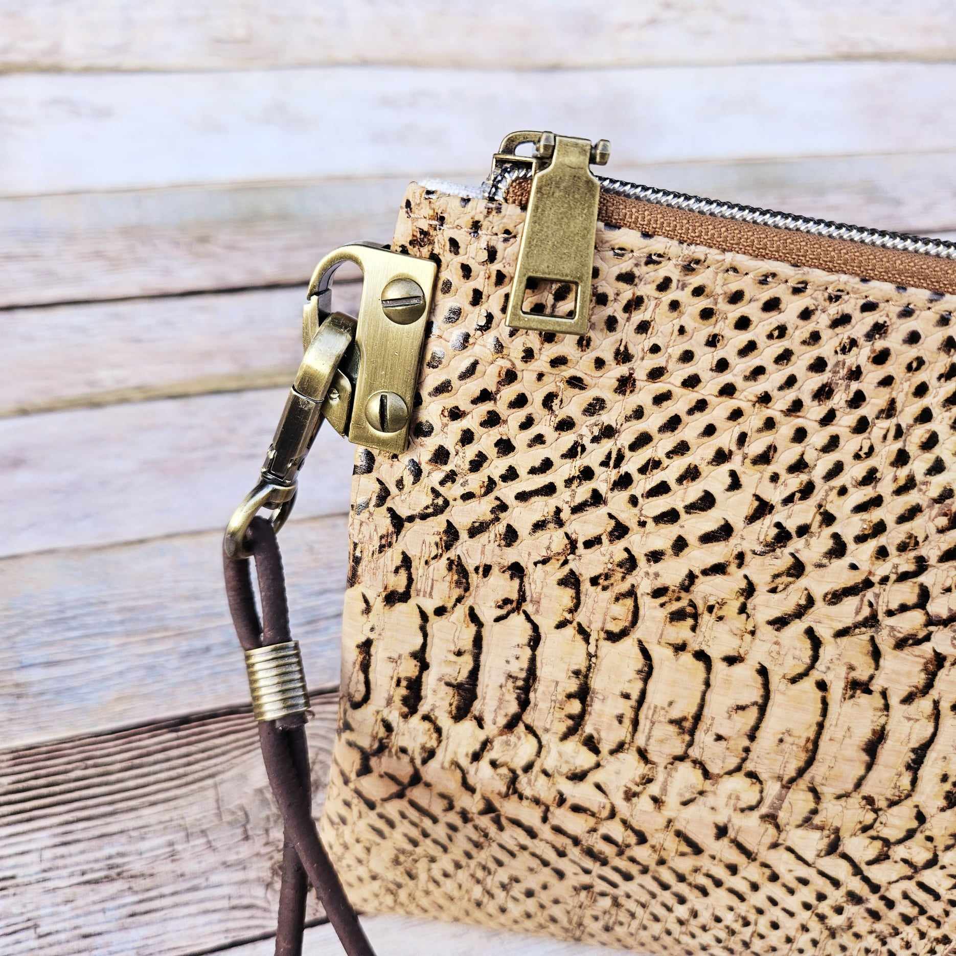 The Oleta Belle cork clutch wristlet is a stylish way to stay organized while on the go. It can be used as a small clutch or with a simple hardware alteration, a crossbody bag. Each wristlet is crafted with quality cork, lined with beautiful fabric, and features several interior card slots. Cork has many material benefits, being supple, durable, and highly resistant to water and most importantly environmentally friendly. The Oleta Bell will perfectly pair with almost any outfit allowing you the ease of safely carrying your phone, keys, cash, cards, makeup and more. Read more on the hardware and materials we use here.